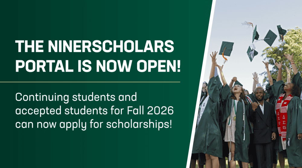Scholarship Portal Opening: The NinerScholars Portal is now open! Current students and newly accepted students who will begin classes in the fall 2026 semester can now log in and apply for scholarships for the 2026-27 academic year. After you log in, you’ll receive a customized list of scholarships that you may be eligible to apply for. Criteria, required materials, and deadlines will be clearly listed for each scholarship. |
