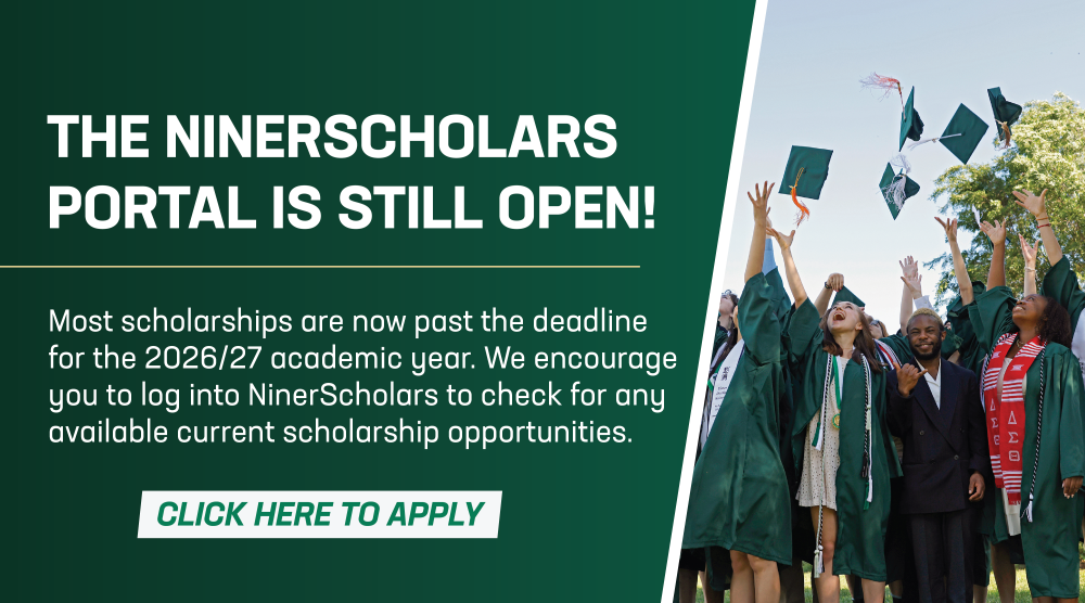 | Scholarship Portal Information: The NinerScholars Portal is currently open, though most 2026-27 deadlines have passed. You may still log in to check for any remaining opportunities. The portal reopens for the next cycle in late October. We will post a website notice once it is live. |